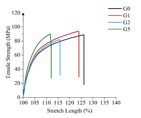 The mechanical properties of the samples were tested using the high-speed rail testing instrument A1-7000M tensile testing machine. Five groups of tests were carried out on each film. Finally, the median was taken as the test result. Figure 11 shows the curves of the tensile strength of the four samples with the stretch length.