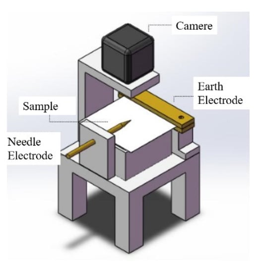 The high-frequency creeping discharge experiment of the sample was carried out using a needle-plate electrode. The experimental system is shown in Figure 13. The sample film with a size of 5 cm × 5 cm was placed flatly under the needle electrode and on the Kapton polyimide pad. The experimental temperature was 20 °C and the relative humidity was 25%. The experimental voltage frequency chosen was 20 kHz.