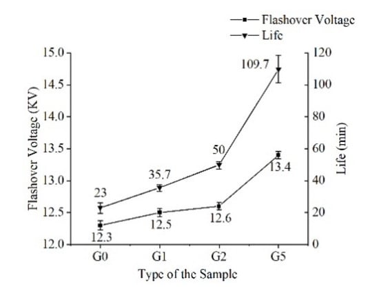 The flashover voltage was measured, and the sample was pressurized at the rate of 0.2 kV/s until surface flashover, which was recorded as flashover voltage. The surface discharge life was measured under the condition of applying the high-frequency sinusoidal voltages of 11 kV and 20 kHz. The time from pressurization to film breakdown was recorded; this is defined as the creeping discharge life. The flashover voltage and lifetime of the samples were characterized by Weibull distribution, as shown in Figure 14.