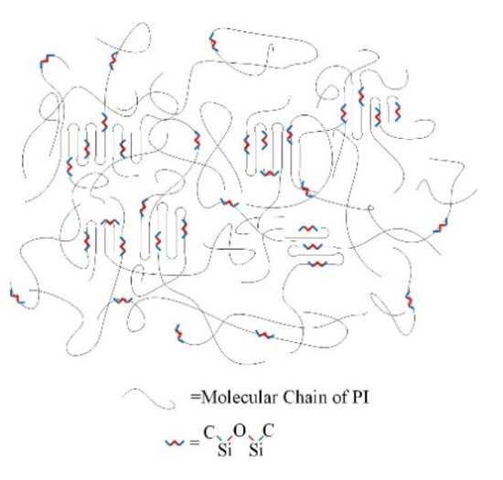 GAPD is a diamine containing Si-O-Si chain, whose molecular structure is shown in Figure 16. The addition of GAPD forms polyimides which are different from the traditional stacking structure, causing more complex changes in material properties. The structural model of the material is shown in Figure 17. The Si-O-Si chain is evenly distributed between the aggregated state and the non-aggregated state, and the Si-C bond at both ends is bonded with polyimide. The Si-O-Si network is cross-linked into a more uniform and stable Si-O-Si network through the intermolecular charge transfer complexation and Van der Waals forces, which effectively improves the compatibility of the Si-O bond with the polyimide matrix, increases the density of the network, and optimizes the physical and chemical properties of the polymer. Except for this, the dispersed Si-O bond in the matrix has high bond energy and high strength, which also enhances the insulating properties of the polyimide molecular chain itself.