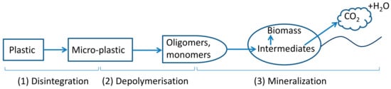 The process of plastic biodegradation typically has three main phases: (1) disintegration/fragmentation/deterioration, (2) depolymerisation (hydrolysis for polyesters), and (3) mineralisation, which involves microbial utilisation of monomers and oligomers from the second phase leading to the release of mainly CO2 and H2O under aerobic conditions (Figure 1) [12,13,14]. Heat, light, mechanical stress, humidity and microorganisms are all drivers that can play a role in the first phase. This initial phase results in modifications in polymer physical (e.g., morphology, weight loss) and mechanical properties (e.g., ductility and tensile strength) and the release of micro- and nanoplastics into the environment. After polymers break down to oligomers and monomers, microorganisms can take them up and utilise them as substrates for metabolism and biomass growth [15]. In the third phase, polymer carbon is converted into CO2 (mainly) and biomass under aerobic conditions.