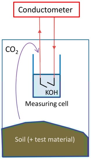 The conductivity of a potassium hydroxide solution (KOH) decreases with increased CO2 absorption [21]. The conductance of the KOH solution can be measured and recorded at user-defined intervals (≥20 min): the present study employed 1 h intervals. The amount of absorbed CO2 (mg) was calculated (Equation (2)) [31] by the Respicond’s native software.