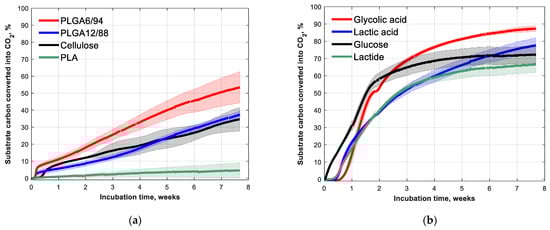 The biodegradation of PLGA12/88 and PLGA6/94 at 25 °C in soil was followed over time, together with cellulose and PLA as comparisons (Figure 3a). After 53 days, 53(±9)% of PLGA6/94 and 37(±2)% of PLGA12/88 was converted into CO2. The PLGA6/94 therefore degraded faster than the PLGA12/88 and the cellulose, which showed comparable degradation. PLA, on the other hand, shows little biodegradation (<5%) at room temperature within the timeframe of this experiment, which is in agreement with what is known from literature [32].This indicates that increasing the GA amount in PLGA copolymers increases the degradation rate.