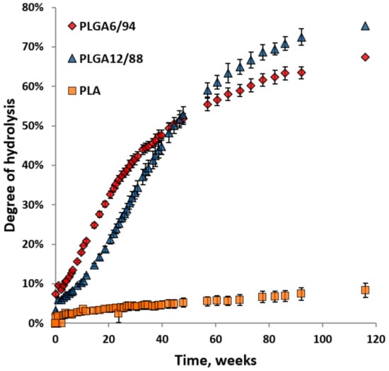 Degree of hydrolysis for PLGA6/94, PLGA12/88 and PLA versus time over 116 weeks at 25 °C in D2O. The points represent the averages of triplicate experiments, with the error bars representing the standard deviation.