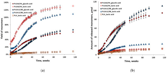 Individual yields (a) and amounts (b) of monomers (glycolic acid and lactic acid) versus time from hydrolysis of PLGA6/94, PLGA12/88 and PLA at 25 °C in D2O. The points represent the averages of triplicate experiments, with the error bars representing the standard deviation.