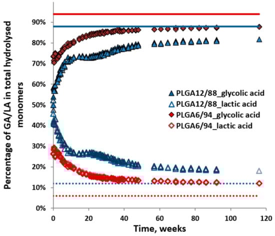 Figure 7 shows the percentage of released glycolic acid (GA) and lactic acid (LA, including dimers and trimers), relative to their sum (i.e., GA/(GA + LA) or LA/(GA + LA)) observed during hydrolysis of the PLGA12/88 and PLGA6/94 copolymers. This provides a visualisation of the ratio of the sum of monomers released in time. It shows that the initial monomer ratio is close to 50/50 for PLGA12/88 and close to 30/70 (LA/GA) for PLGA 6/94. This can be interpreted in two ways: either the polymer contains sections with different monomer ratios, of which the sections highest in LA content hydrolyse first, or the LA-GA bonds across the polymer are hydrolysed and released at a higher rate. This also shows that as the hydrolysis progresses, the GA content increases in the remaining polymer, which in turn could increase the degree of crystallinity and slow down its hydrolysis. The hydrolysis did slow down clearly after about 20 weeks for PLGA6/94 and after about 40 weeks for PLGA 12/88 (Figure 5) [37,38,39].