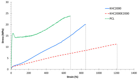 Both KHC2000 and KHC2000E2000 showed a typical elastic behavior up to approx. 20% of strain, followed by a plastic deformation characterized by a sharp increase in stress, probably due to a strain-induced crystallization of the macrodiols [53]. Table 2 summarizes Young’s Modulus, Stress at break, and Strain at break data of PCL, KHC2000, and KHC2000E2000.