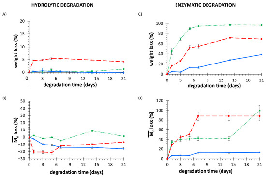 Weight loss profile of KHC2000 (blue, continuous line), PCL (green, dotted line), and KHC2000E2000 (red, dashed line) during hydrolytic (A) and enzymatic (C) degradation at 37 °C. Number average molecular weight loss profile for KHC2000 (blue, continuous line), PCL (green, dotted line), and KHC2000E2000 (red, dashed line) during hydrolytic (B) and enzymatic (D) degradation at 37 °C.
