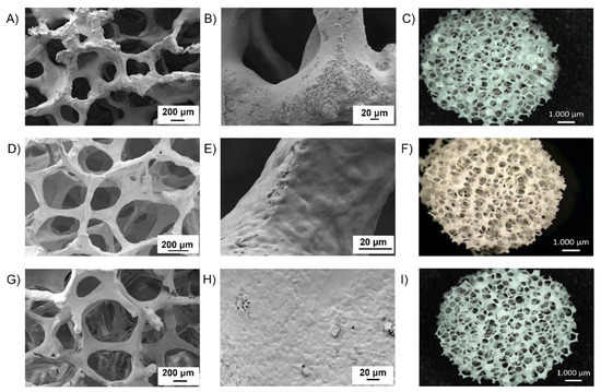 The morphology of pure BG and polymer-coated BG scaffolds (with 3 polymeric layers) was first observed under a light microscope (Stemi 505, Zeiss) equipped with an Axiocam 105 color camera and through Scanning Electron Microscopy (Carl Zeiss Microscopy, software SmartSEM). SEM images were recorded on golden-coated samples and analyzed with ImageJ software to estimate the average pore size and pore size distribution. The average porosity of the scaffolds was calculated before and after the coating (%p1 and %p2, respectively), using the following formulae [37]: