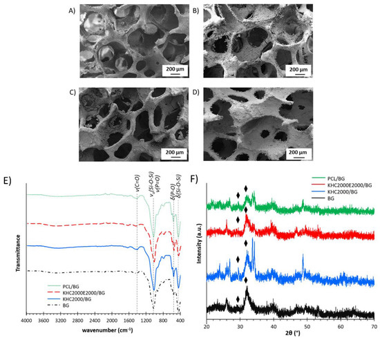 Whereas for commercial PCL the protocol for BG scaffold coating has already been reported by [34], in the case of the PURs an optimization was required to define the best coating procedure for porous BG structures. To this aim, polymer-coated BG scaffolds according to all the investigated conditions were analyzed by SEM to select the best combination of PUR solution concentration and scaffold immersion time that led to samples with an open porous structure (i.e., poor pore-clogging) and homogenous coating. A non-adherent and non-homogeneous coating was obtained by dipping the scaffolds for 1 min (Figure 5A) or 1 day (Figure 5B) in a 0.5% w/v concentrated solution of KHC2000E2000 in chloroform, suggesting that this polymer concentration was not high enough to allow a uniform coating, filling the hollows and the cracks of the structures. With increasing KHC2000E2000 solution concentration to 1% w/v a better coating was achieved, as shown in Figure 5C,D. However, coated scaffolds obtained through a 1-day dip-coating procedure in a 1% w/v concentrated KHC2000E2000 solution in chloroform revealed some clogged pores (Figure 5D). Hence, the best coating was obtained by dipping the scaffold in a KHC2000E2000 solution in chloroform with 1% w/v concentration for 1 min (Figure 5C). Indeed, in these conditions, the coating resulted to be adherent to the scaffold and homogenous.