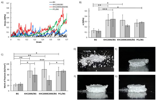 The weight, diameter, height, porosity, and pore size of pure BG scaffolds produced through the foam replica technique are summarized in Table 3. The obtained values are typical for scaffolds produced with this technique [20].