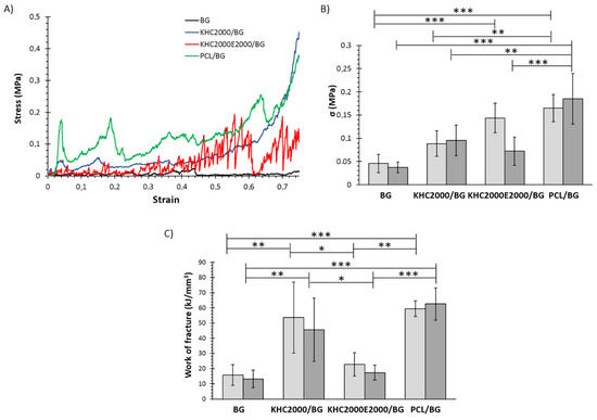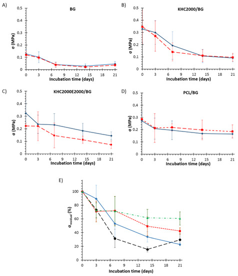 The compressive mechanical properties of uncoated and polymer-coated scaffolds were measured using a Zwick/Roell Z050 mechanical tester at a crosshead speed of 5 mm/min. For pure BG scaffolds and PCL-coated samples, a cell load with a capacity of 50 N was used, meanwhile for PUR-coated matrices a 1 kN cell load was required. During the test, an increasing load was applied on the scaffold until the compressive strain reached 75%. The compressive strength was determined from the maximum load of the obtained stress-strain curve. The work of fracture (W), which is related to the energy required to deform a sample up to a certain deformation, was calculated from the area under the stress-strain curve at a given strain (before densification). To better simulate the in vivo environment, the scaffolds were also tested in wet conditions [47]. To this aim, the samples were soaked in PBS for 30 min before the compressive strength test. Five samples for each condition were tested and the results are presented as the average value and standard deviation. Mechanical tests were also performed on BG and polymer-coated scaffolds after 3, 7, 14, and 21 days of immersion in SBF, to assess their mechanical behavior during concurrent degradation and HA deposition. At each time point, the change in compressive strength (σresidual) was calculated according to Equation (4).