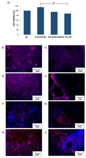 MG-63 osteoblast-like cells were seeded on pure and polymer-coated BG scaffolds and cultivated for 2 days to conduct a primary investigation of the cytocompatibility of the designed composite scaffolds and their potential application for BTE. Cell viability was investigated through WST-8 assay, to obtain a quantitative analysis of the mitochondrial activity of viable cells seeded into the scaffolds. Cell viability was evaluated using BG scaffolds as control samples as large evidence of their ability to enhance adhesion, growth, and differentiation of osteoblasts has been reported in the literature [70,71,72,73,74]. All the composites resulted to be cytocompatible with no significant differences in cell viability between coated and uncoated scaffolds (Figure 14A). However, the relative mitochondrial activity of cells seeded into KHC2000-coated BG scaffolds was significantly (p < 0.05) higher than that assessed on PCL composite scaffolds, suggesting an improvement in cell behavior in PUR-coated scaffolds with respect to samples coated with commercially available poly(ε-caprolactone). To better investigate cell viability and morphology, fluorescence analyses were carried out. Figure 14B-I reports fluorescence images of cells adhered to the scaffolds with cell cytoskeleton and nuclei colored in red and blue, respectively. All the scaffolds were highly colonized by cells also in their inner cavities, thanks to their highly porous and interconnected structure [74].