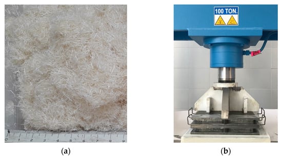 The manufacture of the biocomposites was carried out by manually mixing the dry short sisal fibers and the resin in a special container in order to soak all the fibers well, and then distribute them in a special removable mold measuring 260 × 260 mm. In order to obtain biocomposite laminates characterized by low concentrations of voids, and to obtain a final thickness of 3.5 mm with a 35% volume fraction of the fibers, the optimized compression-molding process developed and tested in [29] was carried out using a 100 ton hydraulic press for a duration of about 24 h at a maximum pressure of about 8.3 bar (see Figure 1b). In detail, the initial impregnation of the fibers took place with an excess of resin, and the desired final fiber volume fraction was obtained by suitably adjusting the final thickness of the panel and the weight of the fibers used for each lamination as reinforcement. These factors were determined by the input data, such as lamination surface (mold measuring 260 × 260 mm) and the density of the fibers (1.45 g/cm3).