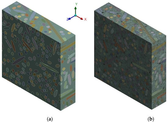 RVE of an epoxy short sisal fiber biocomposite having Vf = 0.35: (a) 3D view, (b) 3D view of the mesh.