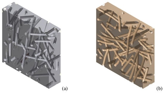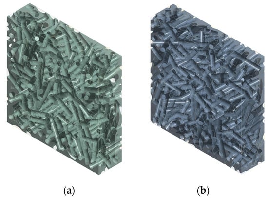 3D transparent view of two different RVEs of an epoxy short sisal fiber biocomposite with Vf = 0.35, as used for the validation of the numerical model: (a) first generation run, (b) second generation run.