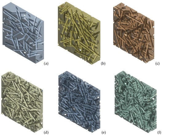 One parameter that can significantly influence the stiffness of the composite is the fiber volume fraction, Vf. In order to analyze the influence of this parameter, RVEs were made with the following values: 0.1, 0.15, 0.2, 0.25, 0.3, 0.35. The other parameters were kept constant, i.e., fiber length 4 mm, straight fibers and orientation distribution of type 0.35 in the x direction, 0.35 in the y direction and 0.3 in the z direction. In accordance with [29], a maximum fiber volume fraction of 0.35 corresponds to the maximum tensile strength. As such, higher fiber volume fractions are not used in the practical applications. A 3D transparent view of the six different RVEs is shown in Figure 6.