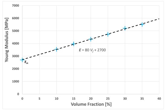 Further validation of the numerical approach was achieved by a comparison with the results reported in [29], where, as shown in Figure 16 [29], the experimental values of the Young’s modulus were reported as a function of the volume fraction for the same biocomposite, green epoxy-sisal fibers. The mechanical tests of Vf values between 0.1 and 0.35 showed linear variation of Young’s modulus. This result agrees perfectly with the results of the numerical models presented here, as shown in Section 3.1.