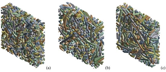 As shown by the theoretical model of discontinuous fibers aligned with the composite plane, stiffness and fiber length are significant influencing factors. Stiffness increases in a nonlinear, monotonic way with increasing fiber length [39,40]. Supposing the notion that the fibers always remain linear (i.e., no curvature occurs after mixing with the matrix), and taking into account that, in general, the maximum composite strength corresponds to a length of about 4–6 mm, RVEs were made with average fiber lengths of 1mm, 4 mm and 8 mm. Figure 8 presents 3D views of the fibers with the three RVEs.