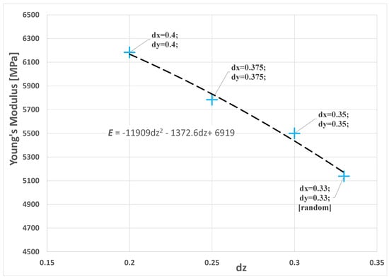 As expected, the numerical results obtained using such RVEs, and reported in Figure 11, showed a linear increase in the stiffness of the composite in the x-y plane as the distribution of the fiber orientation along the z-axis decreased.