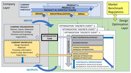Design optimization “layer” compatible with any company size and organization, and applicable at any product lifecycle milestone. Blue arrows represent the “incremental” methodology, continuous improvement, and knowledge capture philosophy.