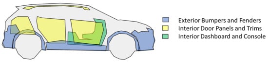 The methodology was first developed to be applied in a competitive and exigent market, such as automotive plastic materials. In detail, the first application is the design review and design optimization of the three main vehicle interior and exterior plastic materials, usually representing the majority (around 58%) of the average vehicle plastic weight [4], (p. 220), as shown in Figure 3.