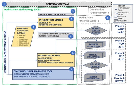The methodology has a set of tools, as shown on the left side of the schema in Figure 4, and a “discrete event” utilization strategy and documents, as shown on the right side of the same schema. The aim of the methodology tools is to be the knowledge capture base, which is oriented towards long-term profitability based on “incremental” development in a comprehensive and continuous improvement way [41]. The discrete event strategy and documents are defined to take maximum advantage of the methodology tools in every application loop, and to help to document the analysis, calculations, and decisions carried out in each event. The methodology tools are shown with numbers inside blue circles in Figure 4, and each of the main characteristics are described in the following: