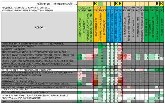 - Multi-criteria evaluation set: This is usually defined by the company directors, based on existing key performance indicators (KPIs), and is as complete and stable as possible to allow comprehensive and comparable evaluations. In our case, we used the QCDP set of KPIs (quality, cost, delivery delay, and performance), which is well known in the automotive and product development industries [43,44]. However, we detected that this set of criteria lacks an environmental impact evaluation [25,26,27], and as a consequence, the team developed a QCDP+E set (+E denotes environmental impact). In addition, the team detected the need for several “sub-criteria” for each main one, which would be useful for better impact evaluation, and would also enable the detailed definition of targets and restrictions, resulting in the criteria set shown in Table 2.