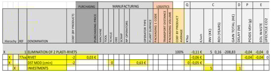 It is possible to apply this kind of algorithm to any mathematic software working with a matrix or also any database or spreadsheet software that can filter and sort information. In the practical application, the lines of the interaction matrix were verified for “target” and “restrictions”. Lines that did not meet these requirements were rejected. As shown in Figure 6, changes were ordered based on their impact on the target.