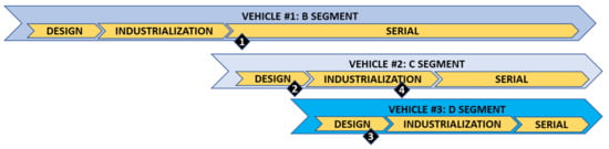 The main objective of the methodology development was to improve the design optimization duties, reduce subjectivity, accelerate optimization, and improve the knowledge capture, ensuring the consideration of the company directors’ business strategy and customer and market demands. The methodology was already applied during 2020 and 2021 in four “Discrete Optimization Events” for three different vehicles of the European market; in three different market segments (B, C, and D); and in different vehicle lifecycle milestones, from the design phase to industrialization and serial production phases, as described in Figure 8.