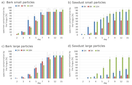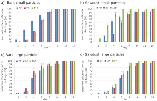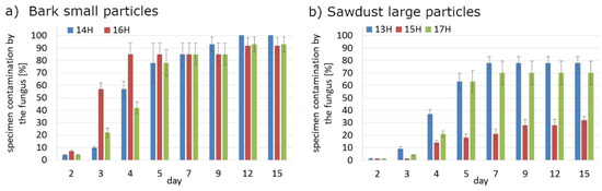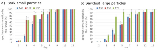 - Composites filled with bark were characterized by a higher growth rate of mold fungi compared to composites filled with sawdust.