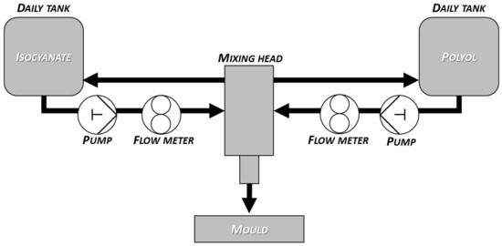 The samples were produced with a high-pressure reaction casting machine (Topline KH by Hennecke GmbH, Sankt Augustin, Germany). The equipment is mainly suitable for the production of molded polyurethane soft foam elements, but it is also possible to produce other types of polyurethane systems within the given raw material ratios and machine parameters. Production was carried out in a 400 × 400 × 100 mold. The mixing of the components takes place in the mixing head with a counter-current injection process. The dosing is carried out in thermostated aluminum molds in the mold-carriers (FRIMO Group GmbH, Lotte, Germany) using an ABB robot arm with a high-pressure mixing head. After the injection, the mold carrier closes for the time of the foaming reaction. Proper mold filling is carried out by the eccentric movement of the mold carriers. Upon foaming, the air cushions are released, allowing the carbon dioxide generated during the reaction to escape, which can be done during the reaction if necessary. During production, any other form-bearing movement can be set on the human–machine interface (HMI, Frimo Group GmbH, Lotte, Germany). At the end of the process, the mold-carrier opens, and the finished sample can be removed. Molds need to be treated with a release agent at intervals to make it easier to remove the sample before production begins [24]. The simplified process flow diagram for flexible polyurethane foam production is shown in Figure 1.