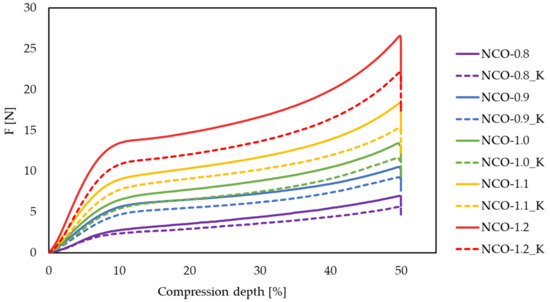 The average compression depth–force curves were recorded for each NCO-index (Figure 2). As the hardness of the foams increased with increasing NCO-index, given that the hard segments were determined by the amount of isocyanate, the compressive force (F) also gradually increased from an average of 5.69 N for an NCO index of 0.8 to 20.67 N in case of the samples with 1.2 NCO-index.