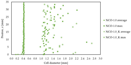 Average and maximum cell diameters along the sample height of the NCO-1.0 sample examined with a micro-CT before (NCO-1.0, filled circles and squares) and after (NCO-1.0_K, empty circles and squares) dry heat aging.