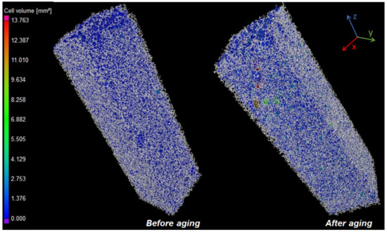Extraordinarily large cells can also be observed in the case of the sample after aging with a volume of up to 13.76 mm3, which corresponds to a diameter of 2.97 mm if the cell is considered a perfect sphere. This supports that cell-wall damage may have occurred during aging.