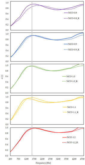 Average curves of the sound absorption coefficient (α). The samples were tested before and after aging, and the NCO index varied from 0.8 to 1.2. The average curves of the samples after dry heat aging are marked with K. The gray line marks the local maximum (~1300 Hz) from which the useful frequency range begins.