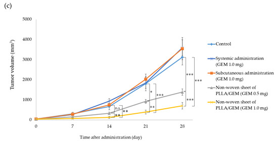 2.8. Antitumor Efficacy of the GEM-Containing Non-woven Sheets in a Subcutaneous Tumor-Bearing Mouse Model