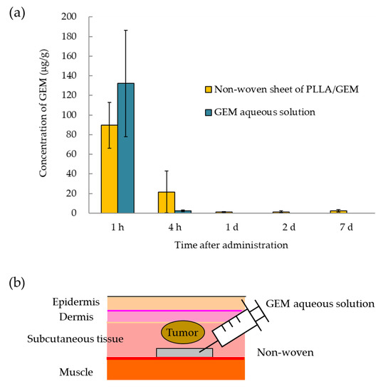 GEM tissue concentrations in areas surrounding the non-woven sheet were measured in both groups, namely, that subcutaneously administered the GEM solution and that subcutaneously implanted GEM-containing non-woven sheets (Figure 4a,b).