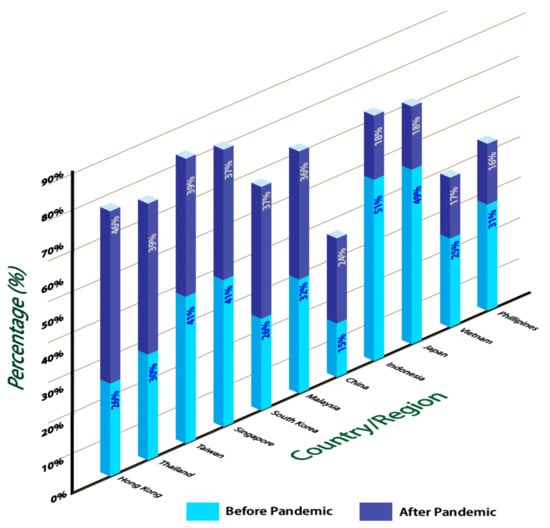The consumption of food packaging was said to have increased during this pandemic (Figure 1) [11]. A comparison of different regions shows that the consumption of food packaging before and after the Covid-19 pandemic vary strongly. Apparently, Indonesia has contributed to a large amount of food packaging consumption before the pandemic caused by Covid-19. During the pandemic, Hong Kong passed as the highest region consuming food packaging. Because of the pandemic, there is a high concern regarding the hygiene and safety aspects by customers. Most people have resorted to their last option of buying bulk stocks of groceries or having their meals taken away. According to the Agriculture and Horticulture Development Board (AHDB) in its 2020 article on ‘Takeaway food performance during Covid-19’, the pandemic effect has urged people to switch from dine-in to takeaway-delivery due to social distancing recommendations.