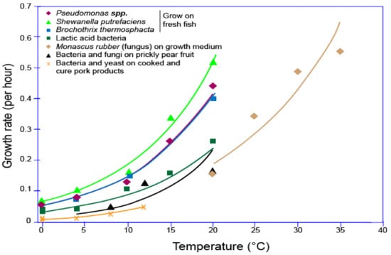 The reactions of bacteria, enzymes, molds, and some microorganisms towards the surrounding humidity and temperature on different types of foods also contribute to food spoilage in the food packaging [12,13,14,15], as displayed in Figure 2 [16]. Figure 2 shows that Shewanella putrefaciens’ growth rate on fresh fish was the highest compared to Pseudomonas spp. and Brochothrix thermosphacta, which was around 0.5 per hour at 20 °C. On the other hand, bacteria and yeast on cooked and cured pork products showed the lowest growth rate, which was less than 0.1 per hour at around 12 °C. However, Monascus ruber (fungus) showed a unique growth rate, which started when the temperature was at 20 °C with less than 0.2 per hour and rose gradually to more than 0.6 per hour. Some researchers did their research on how to lower this carbon footprint [17,18].