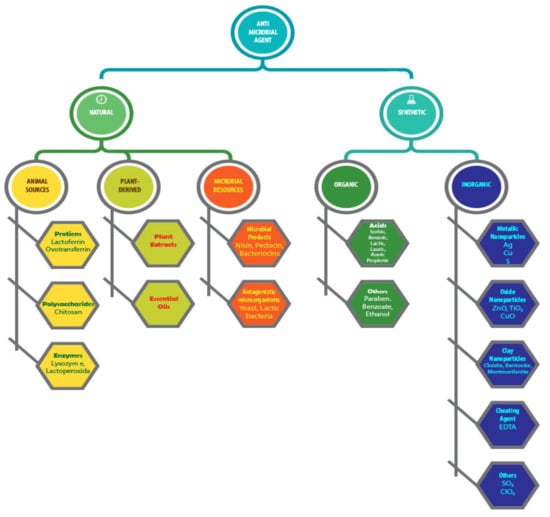 Various types of antimicrobial agents have been investigated for their potential applications in the antimicrobial packaging, and some of the examples are presented in Figure 3. Each of the antimicrobial agents has a unique mechanism and reacts differently to different types of microorganisms. In this case, the types of antimicrobials sometimes set restrictions for their applications. In general, these compounds can be classified into synthetic and natural classes based on their sources and physiologies. The synthetic antimicrobial agents can be further categorized as organic and inorganic. The literature reports various types of synthetic antimicrobial agents such as metallic nanoparticles (Ag, Cu, S) [40], oxide nanoparticles (ZnO, TiO2, CuO) [41], clay nanoparticles (bentonite, cloisite, montmorilonitrile) [42], chelating agents [43], volatile compounds (SO2, ClO2, ethanol) [44], organics acids and their salts [45], etc. [25,46]. The type of antimicrobial agents selected may differ depending on for which application the packaging material is being used. Basically, synthetic organic compounds containing ethylene diamine tetraacetic acid (EDTA), parabens, fungicides, and other chemicals are the major antimicrobial compounds used in the food packaging industry [47]. In particular, metal and metal oxides are potential antibacterial agents, but issues concerning their long-term impact on the environment and human health remain unresolved. On the other hand, the use of silver-based antimicrobial packaging for food purposes is expected to grow and has been used in countries such as Japan and the United States [48].