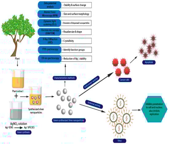 There were two ways of synthesizing the AgNPs in biological methods, which are intracellular or extracellular [50,51,52]. For the extracellular process, it involves trapping the metal ions on the outer surface of the cells. Then, it aims to reduce the silver in the presence of biomolecules. On the other hand, for the intracellular, the process takes place inside the microbial cells [53]. Extracellular synthesis was shown to be preferable in most studies compared to intracellular due to its simplicity, lower cost, and preferred large-scale production [51,53,54]. Additionally, some of the advantages of using this biological method are that it is environmentally friendly, does not produce any toxic residue, and is cost-effective [53,54,55,56,57,58,59]. Figure 4 shows the illustration of biological synthesis of silver nanoparticles using plant extraction.