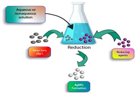 Next, chemical synthesis of silver nanoparticles was also reviewed [53,55,59]. In this method, chemical reduction was discussed [53,55]. Reducing, stabilizing, or capping agents were used in this method. The size distribution of the produced silver nanoparticles was stated to be influenced by these agents [57]. The simple equipment used and the convenience of the chemical reduction are the benefits of using this method [60]. Nonetheless, this method is not widely preferred due to the requirement of using harmful chemicals such as sodium citrate, borohydride, potassium bitartrate, and sodium dodecyl, which are very toxic [53,61]. Additionally, this method was mentioned to yield toxic by-products during the process [59]. Figure 5 shows chemical synthetization of silver nanoparticles.