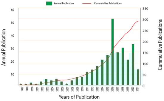 This review on antimicrobial packaging for various applications was supported with bibliometric analysis as a systematic approach. Data used in the present study were retrieved on 8 June 2021 from Scopus. Data from June 2021 onwards were not considered in this study for data consistency. Presently, to this writing, the keyword search analysis in Scopus on the query string (TITLE-ABS (“antimicrobial packaging”)) AND TITLE-ABS (food*) AND PUBYEAR < 2021 OR PUBDATETXT ((“January 2021” OR “February 2021” OR “March 2021” OR “April 2021” OR “May 2021”)) AND (EXCLUDE (PUBYEAR, 2022)) AND (LIMIT-TO (LANGUAGE, “English”)) resulted in 306 documents (Figure 7) wherein 195 were research articles, 56 were book chapters, 33 were review works, 18 were conference papers, and 4 were books (8 June 2020).