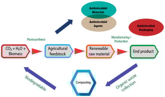 The next part of the review was concerned with the performance of antimicrobial packaging towards environmental impact, as shown in Figure 8. Looking at Figure 8, it is apparent that the antimicrobial packaging showed a positive impact on the environment as well as in the ecosystem cycle. One concept that emerged during the extensive review was antimicrobial agents and material that normally come under renewable raw material provide added value in ensuring ecosystem sustainability. This is because, if antimicrobial packaging is made from a combination of antimicrobial agents and materials that are based on renewable raw materials, it may accelerate the biodegradation process and further stabilize the ecosystem balance. These results suggest that antimicrobial packaging is not only able to show the ability of controlling the growth of microorganisms and prolonging the shelf life of food, which is very important in food safety, but also has a positive effect on the environment [129].