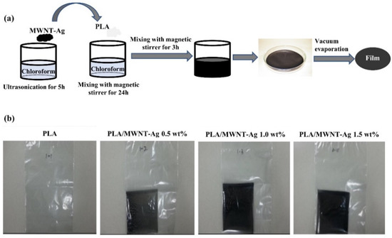 PLA/MWNT-Ag films prepared by solvent casting: (a) schematic illustration of the sample preparation; (b) PLA/MWNT-Ag film samples with different MWNT-Ag concentrations.