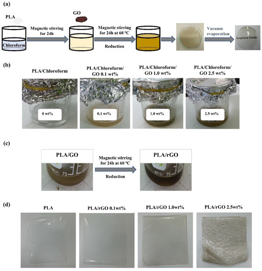 PLA/rGO films prepared by solvent casting: (a) schematic illustration of the sample preparation; (b) PLA/GO solutions with different GO concentrations; (c) color change of PLA/GO solution before and after reduction; and (d) PLA/rGO film samples with different rGO concentrations.