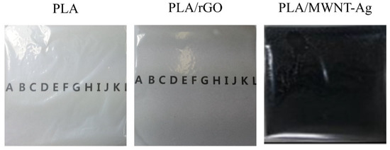 All PLA/MWNT-Ag films were opaque with a low-weight percentage of MWNT-Ag (Figure 1b), whereas, the PLA/rGO films were transparent at lower rGO concentrations (Figure 2d). However, the PLA/rGO films became slightly opaque when the concentration of rGO was higher than 2.5 wt%, owing to the uneven dispersion of the rGO particles. As shown in Figure 3, a highly transparent sample of the PLA/rGO 1.0 wt% film was observed, similar to the PLA film.