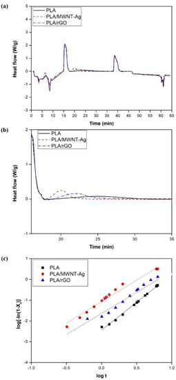 The crystallization kinetics of the PLA-based films were evaluated. Figure 4a shows the overall heating–cooling–heating cycles for the crystallization behaviors of the PLA, PLA/MWNT-Ag, and PLA/rGO films. The isothermal scanning results of the PLA-based films are presented in Figure 4b, and it can be observed that it takes more than 15 min to fully crystallize pure PLA, while the crystallization time is reduced by almost one third for the PLA/MWNT-Ag and PLA/rGO films. The crystallization rate increases with the addition of nanoparticles, which can react as nucleation agents. The Avrami equation was used to evaluate the isothermal crystallization mechanisms of the PLA, PLA/MWNT-Ag, and PLA/rGO films. The relative crystallinity could be calculated from Equation (2):