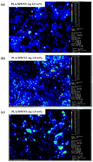 EPMA mapping images of PLA/MWNT-Ag films: (a) PLA/MWNT-Ag 0.5 wt%; (b) PLA/MWNT-Ag 1.0 wt%; and (c) PLA/MWNT-Ag 1.5 wt%.